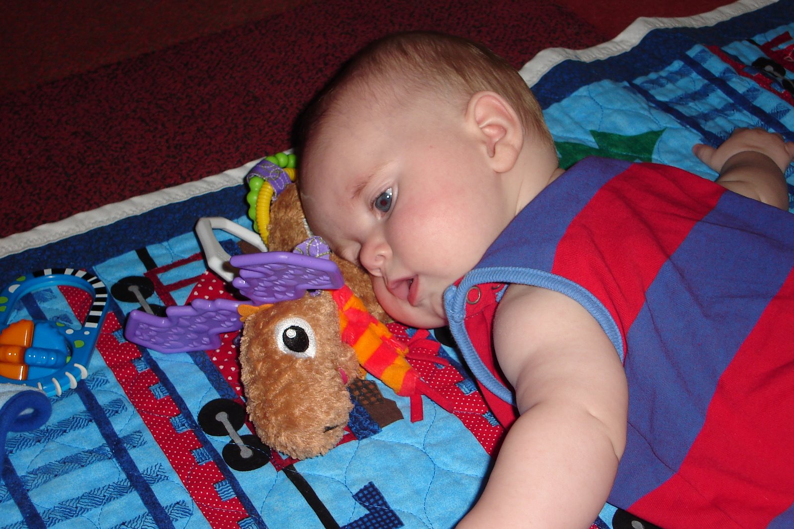 Levi was playing on the floor one day and decided that his moose would make a great pillow. It was quite funny.