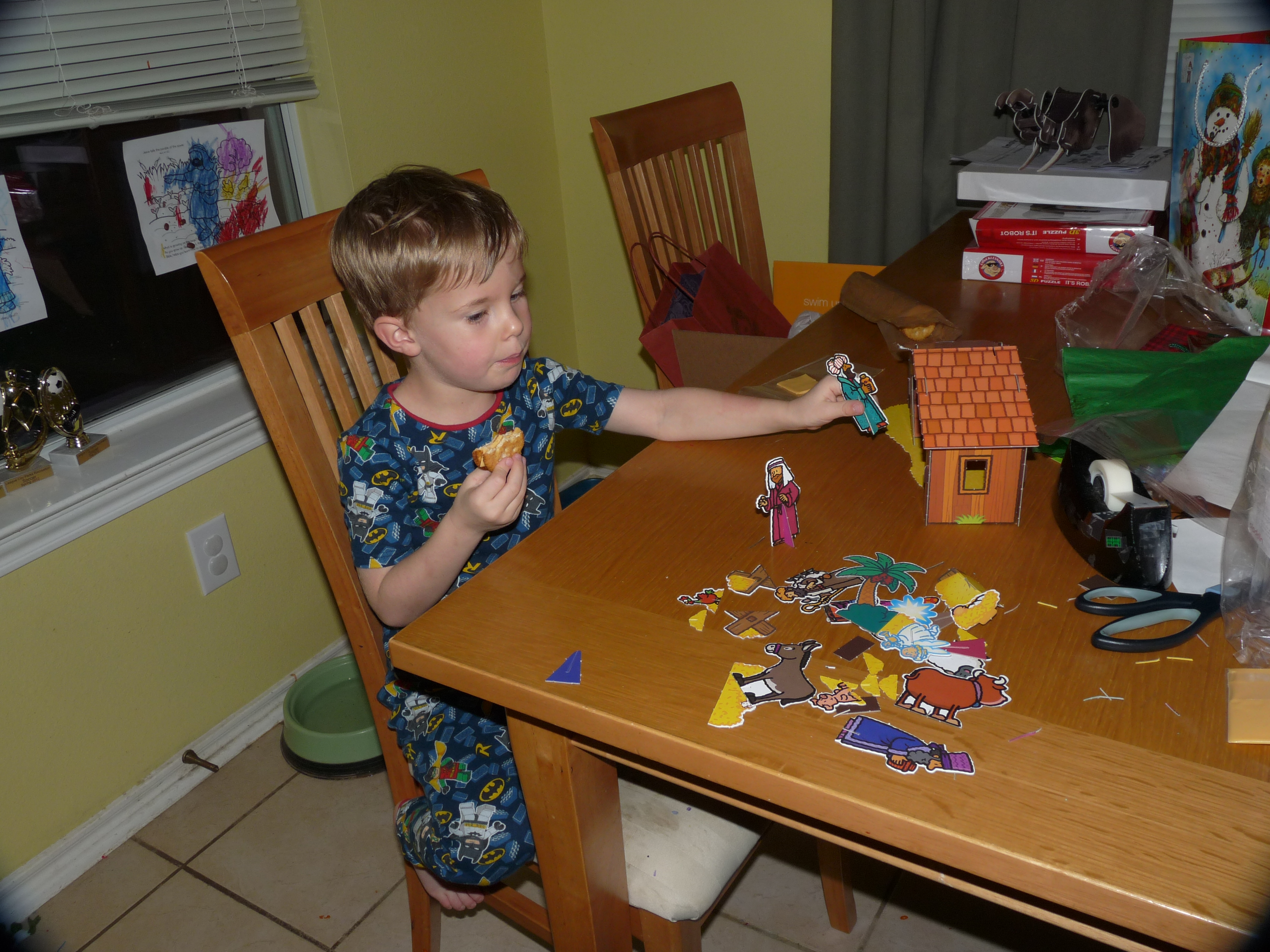 Levi got a cool book with a manger scene to put together in it.