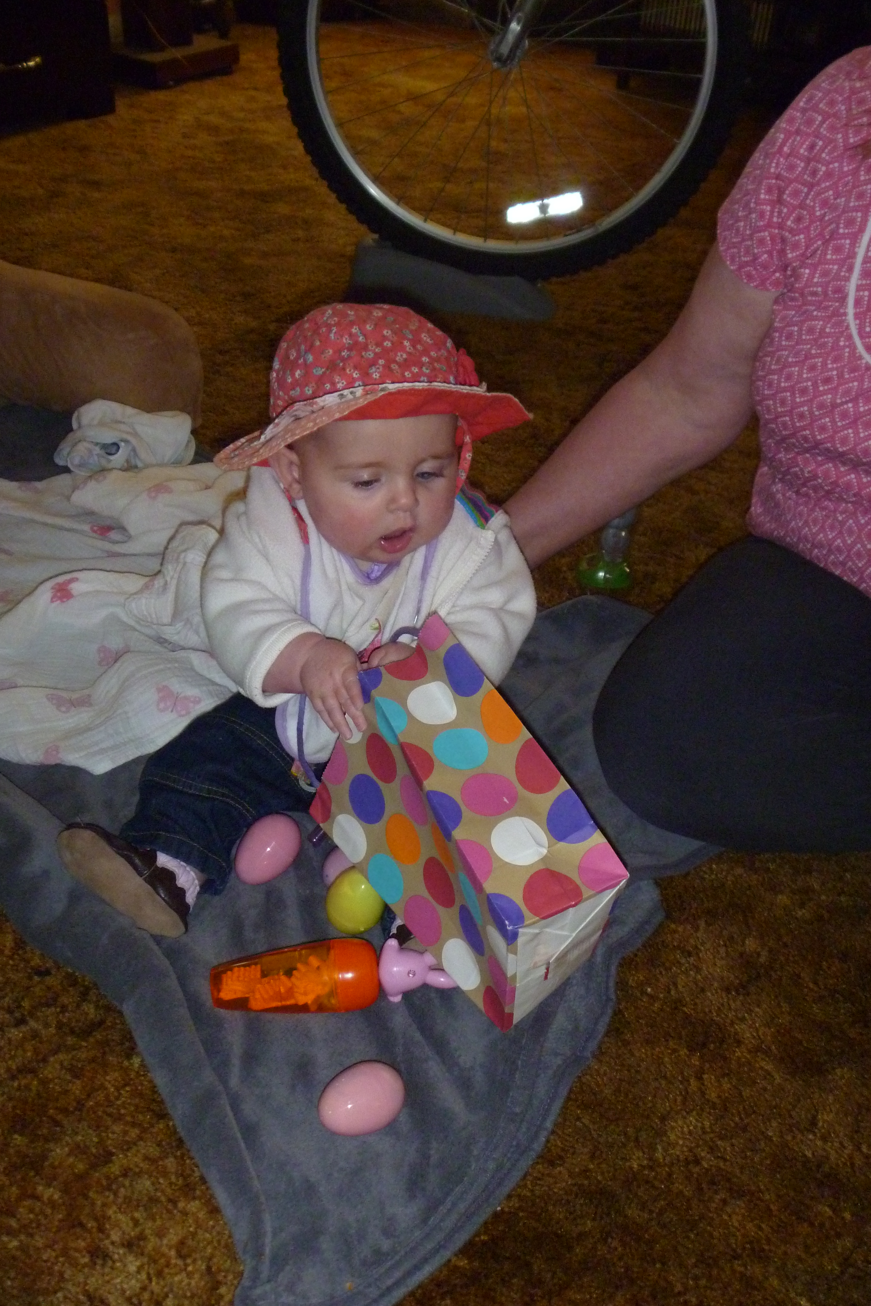 Checking out the loot. Bethany was interested in it all, even the bag